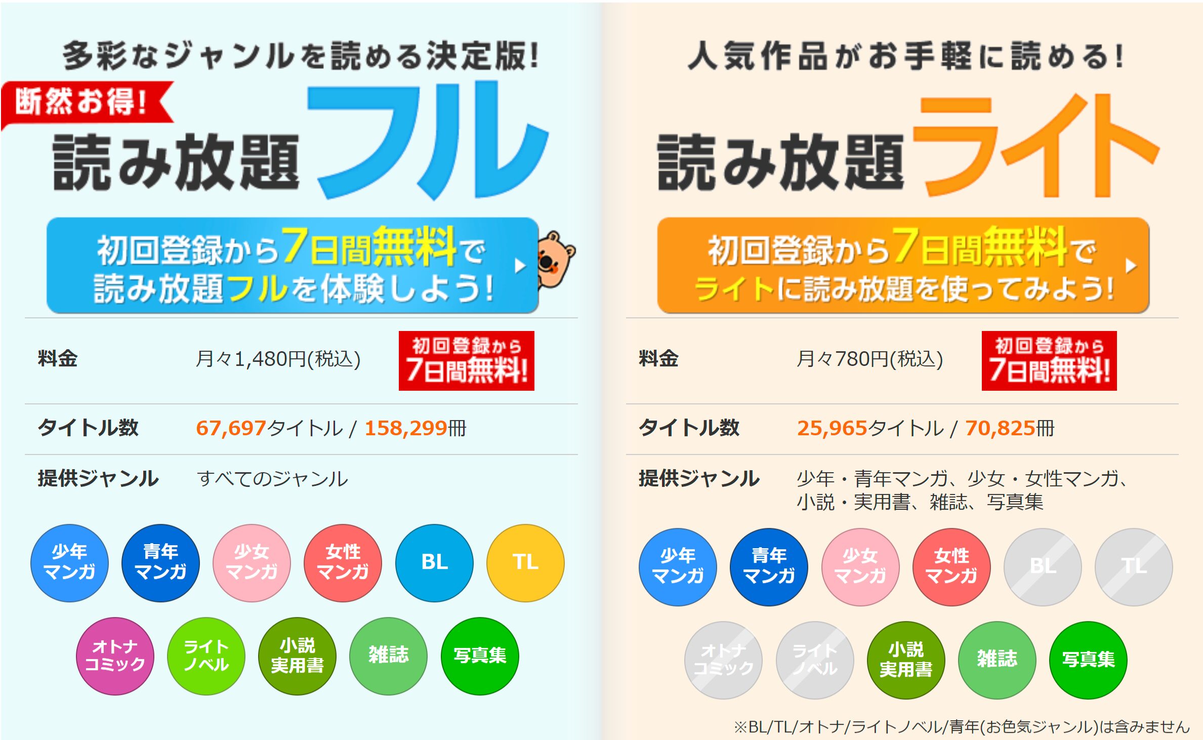 読み放題の月額プランが2つあります。読み放題ライト 780円(税込) 6.8万冊以上、読み放題フル 15.8万冊以上は1,480円(税込)があり、ジャンル数の差で料金が異なります。※BL、TL、アダルト、ライトノベルは読み放題フルのみとなります。ポイント制も導入されており、ポイントを利用して漫画を購入することも可能です。初回利用はお得なクーポンがついてますし、定期的にクーポン発行しています。