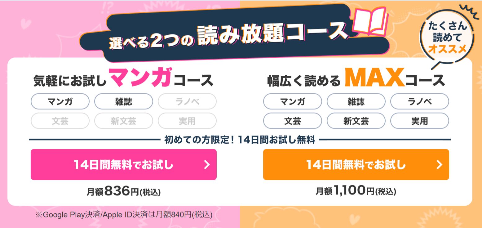 購入パターンと読み放題パターン(月額)があります。読み放題は2つプランです。漫画、雑誌が読めるマンガコース 836円(税込)、サイト内のすべてのジャンルが読めるMAXコース1,100円(税込)とリーズナブルです。ポイント制も導入されており、ポイントを利用して漫画を購入することも可能です。還元やクーポンがあり、目的に応じて使い分けられます。